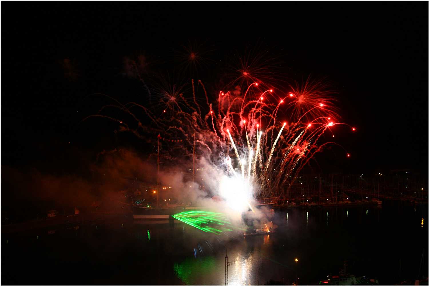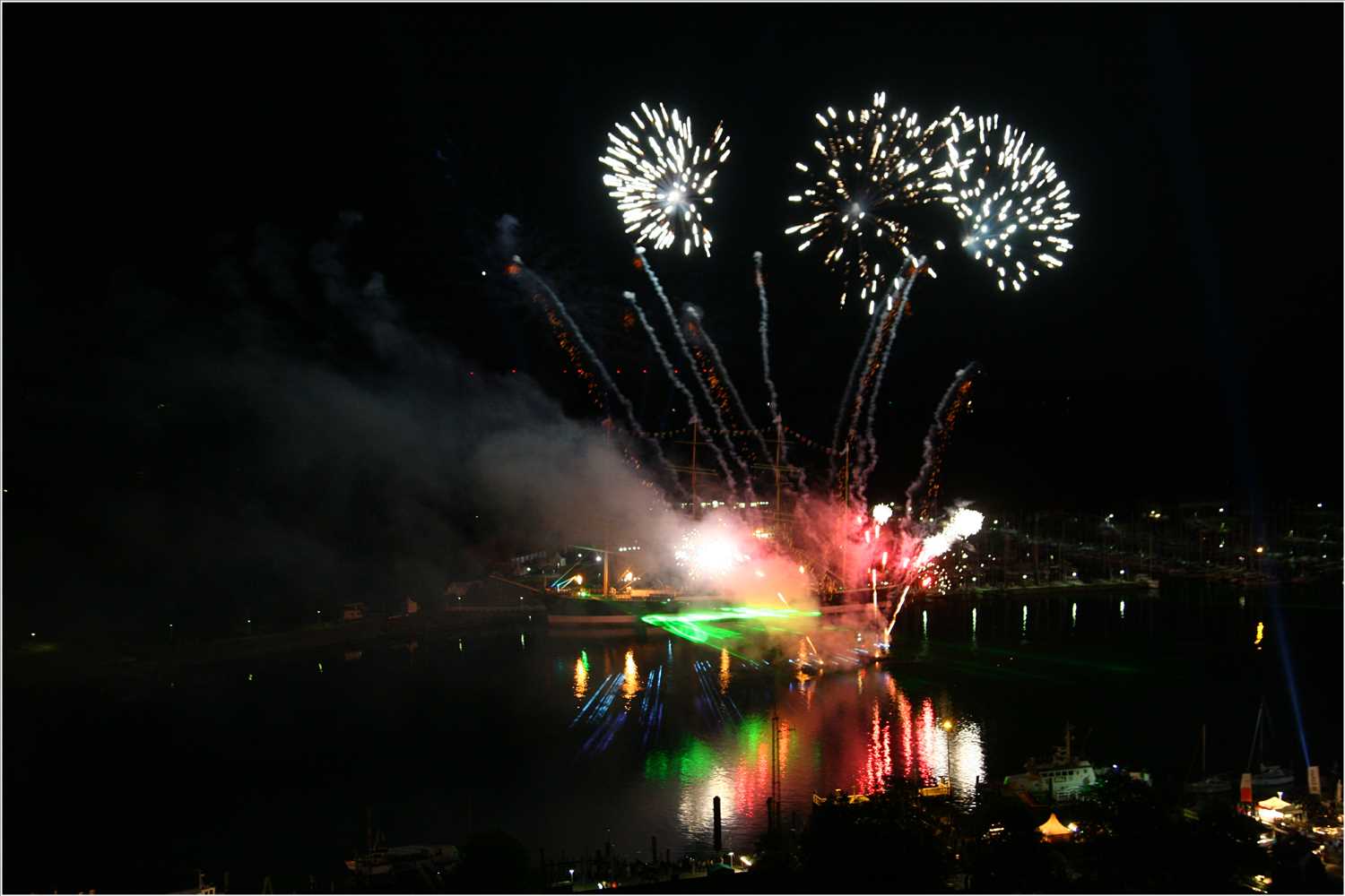 Laser- und Feuerkwerksshow anlässlich der 100-Jahr-Feier der Viermastbark Passat