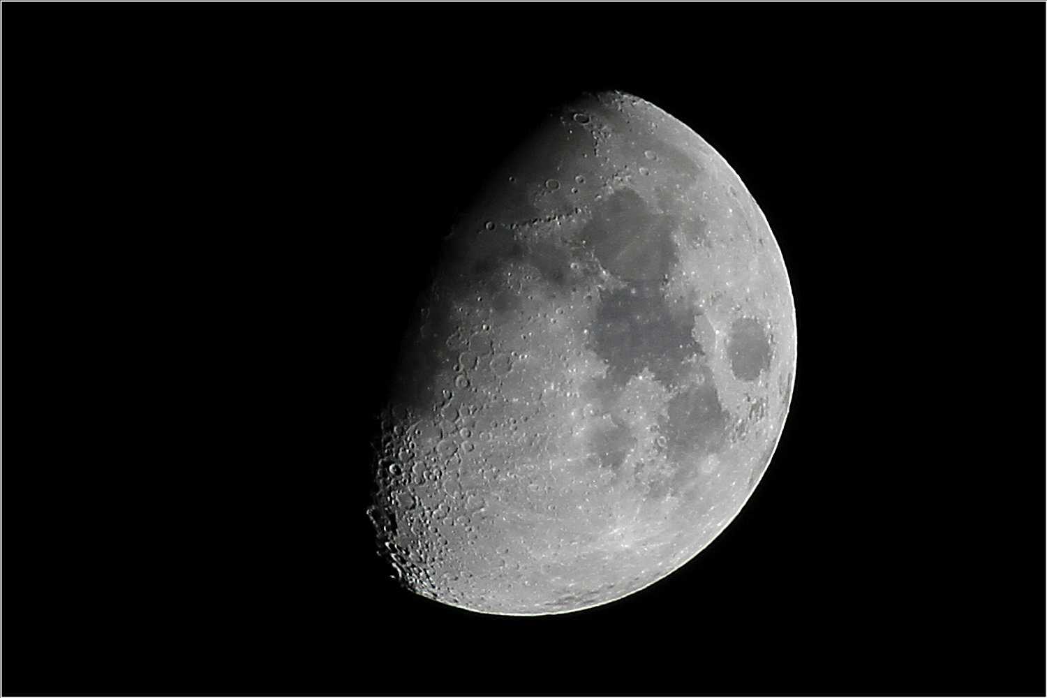 Schon ab einer Brennweite von 300 mm lassen sich recht gute Mondaufnahmen realisieren. Während ein voller Mond recht platt wirkt, zeichnen sich in der Mondphase gut die Krater an den Randbereichen ab, auch am Tage.