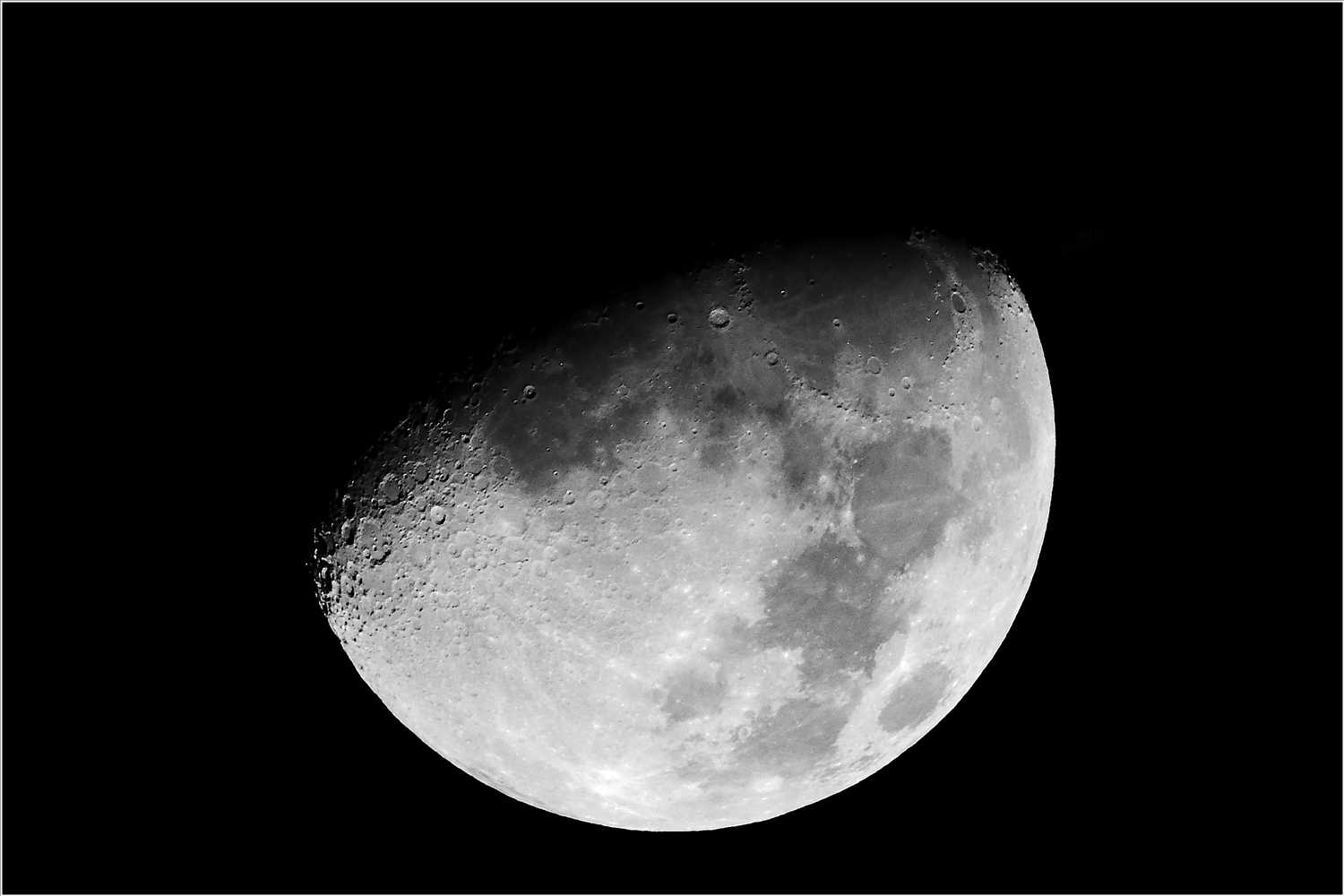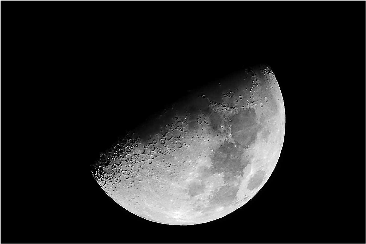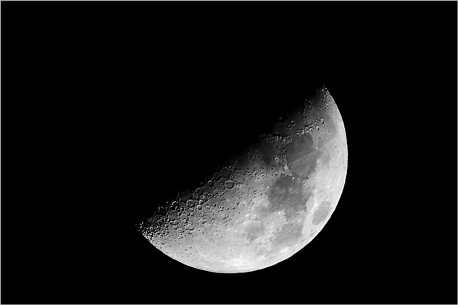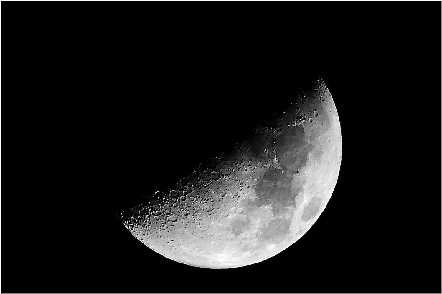 Schon ab einer Brennweite von 300 mm lassen sich recht gute Mondaufnahmen realisieren. Während ein voller Mond recht platt wirkt, zeichnen sich in der Mondphase gut die Krater an den Randbereichen ab, auch am Tage.