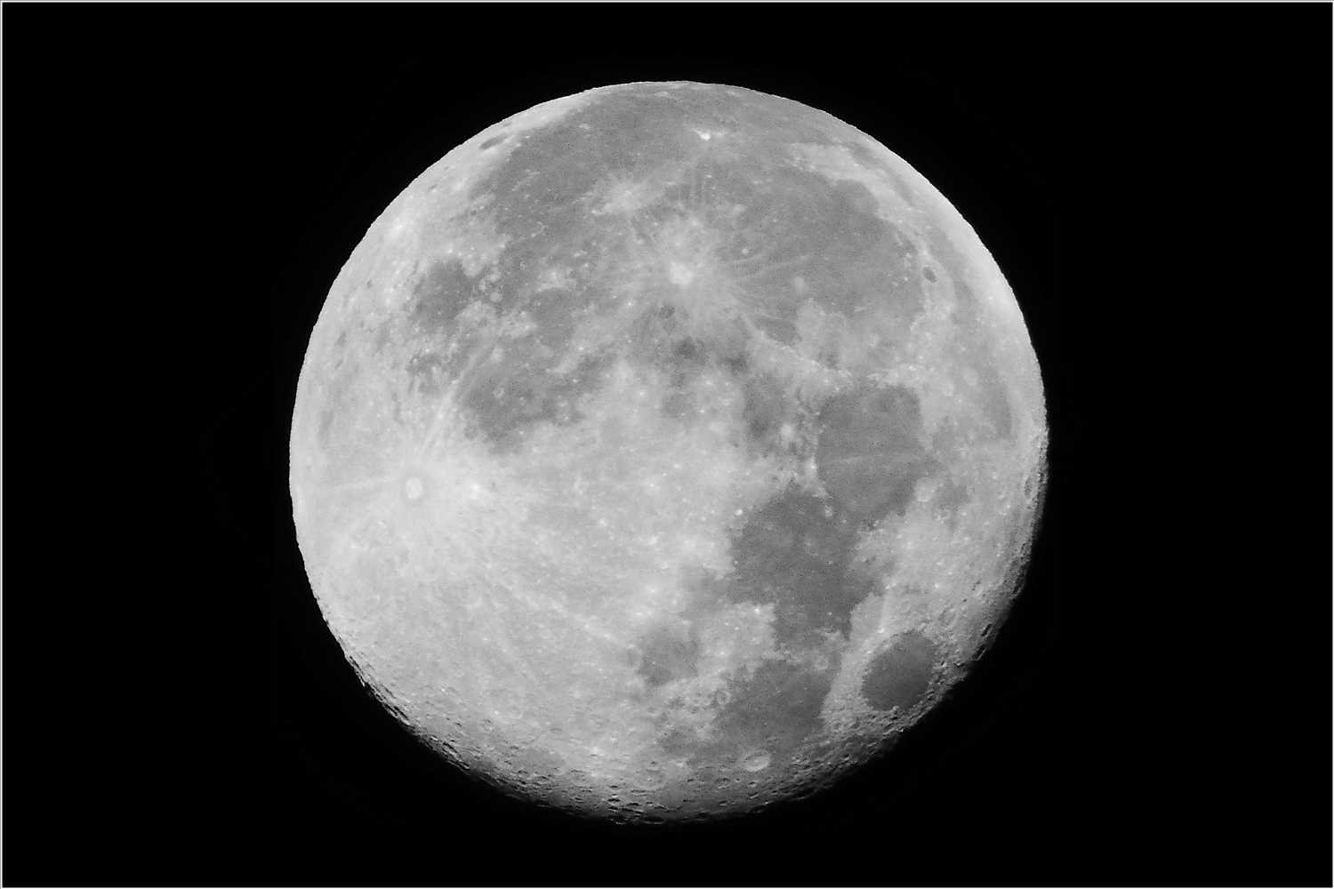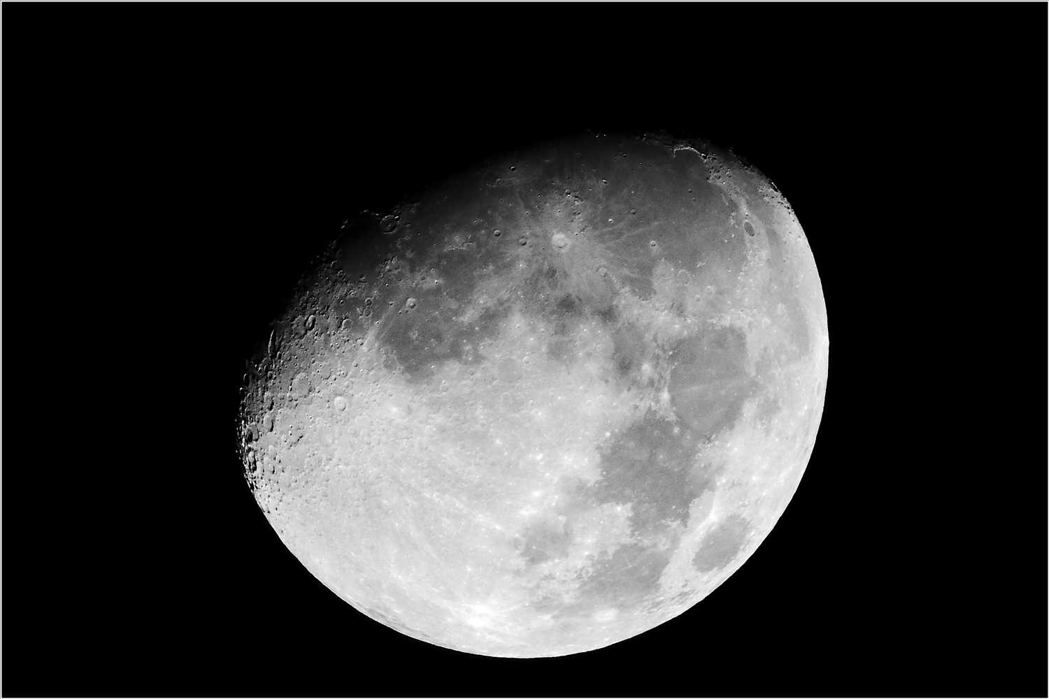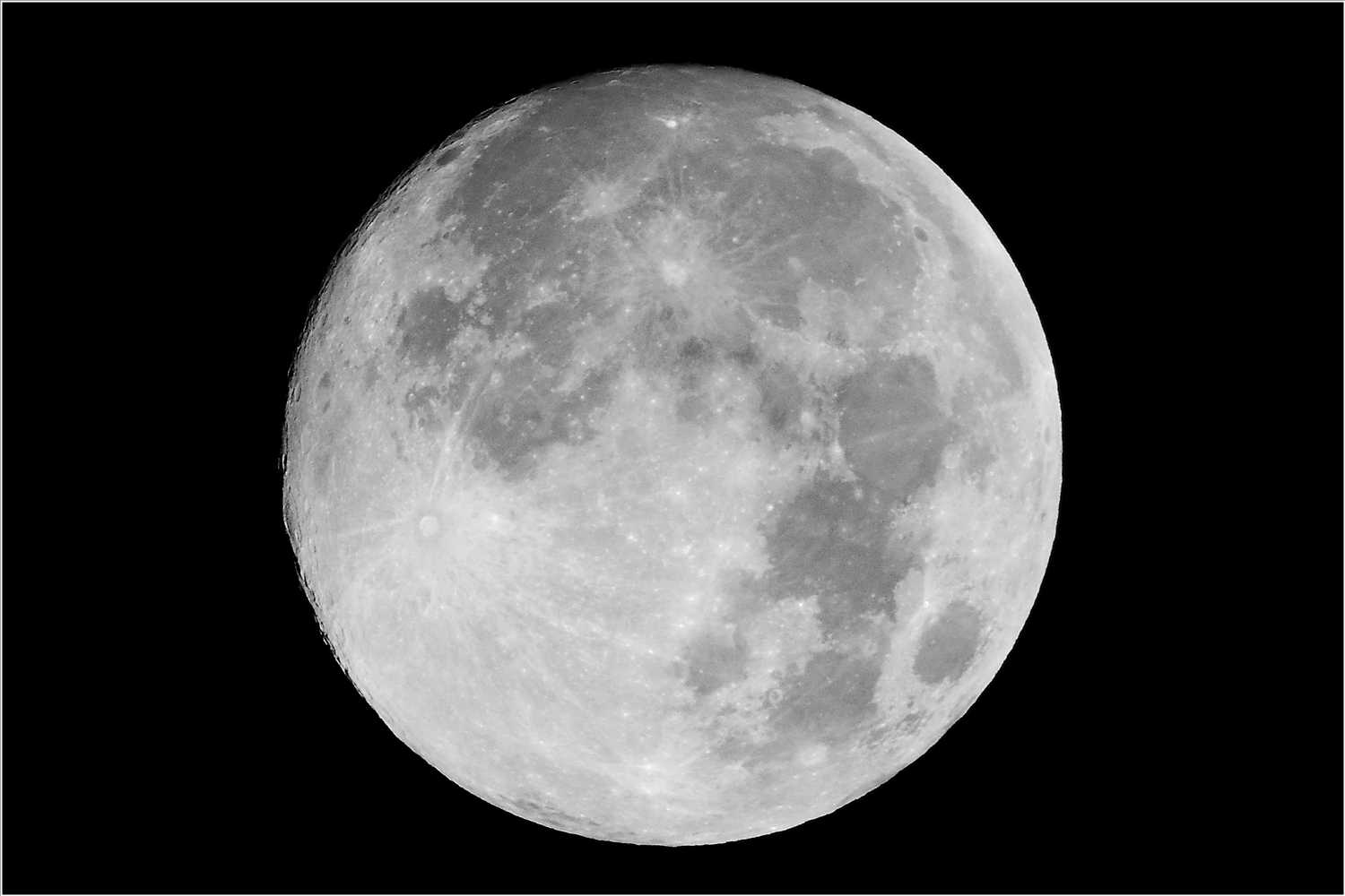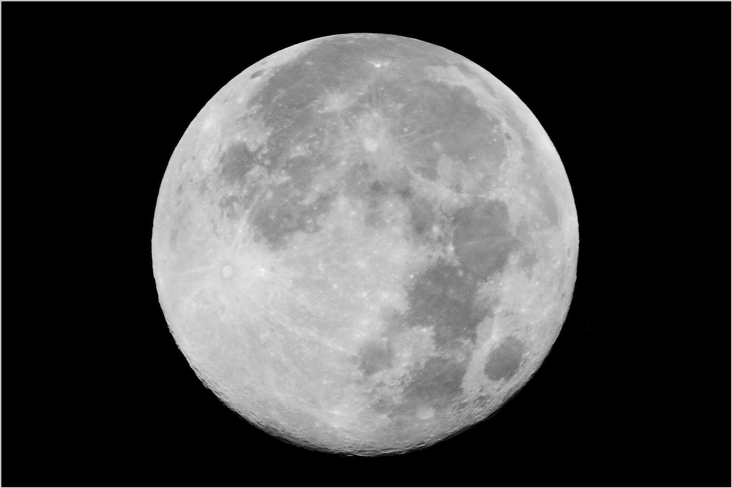 Aufnahmen mit einem 300er-Tele nehme ich immer im RAW-Modus auf und kopiere den Mond in ein schwarzes Bild mit den Abmessungen 1500x1000 Pixel. So wird der Mond bei einer 32-MP-Aufnahme mit einem 300er-Tele formatfüllend dargestellt.