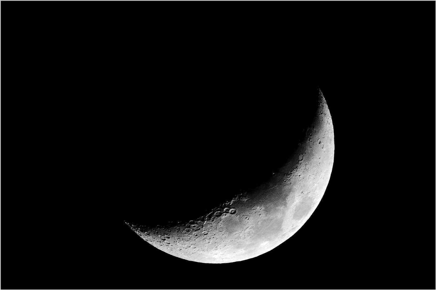 Der Mond bewegt sich erstaunlich schnell über den Nachthimmel. Insbesondere im vergrößertem Live-View-Modus ist diese Bewegung deutlich zu erkennen. Um Bewegungsunschärfe zu vermeiden, müssen relative kurze Belichtungszeiten gewählt werden, mit ISO 800 und 1/125 bis 1/400 Sek erreicht man mit Blende 8 oder 9 eine solide Grundschärfe ohne Überstrahlung.