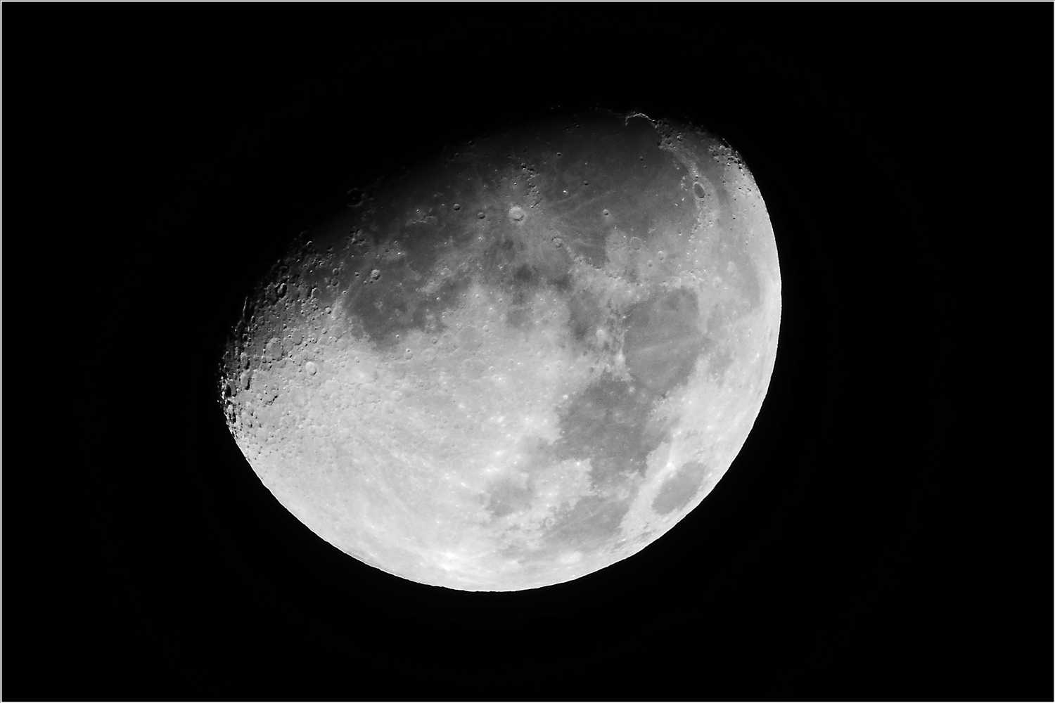 Aufnahmen mit einem 300er-Tele nehme ich immer im RAW-Modus auf und kopiere den Mond in ein schwarzes Bild mit den Abmessungen 1500x1000 Pixel. So wird der Mond bei einer 32-MP-Aufnahme mit einem 300er-Tele formatfüllend dargestellt.