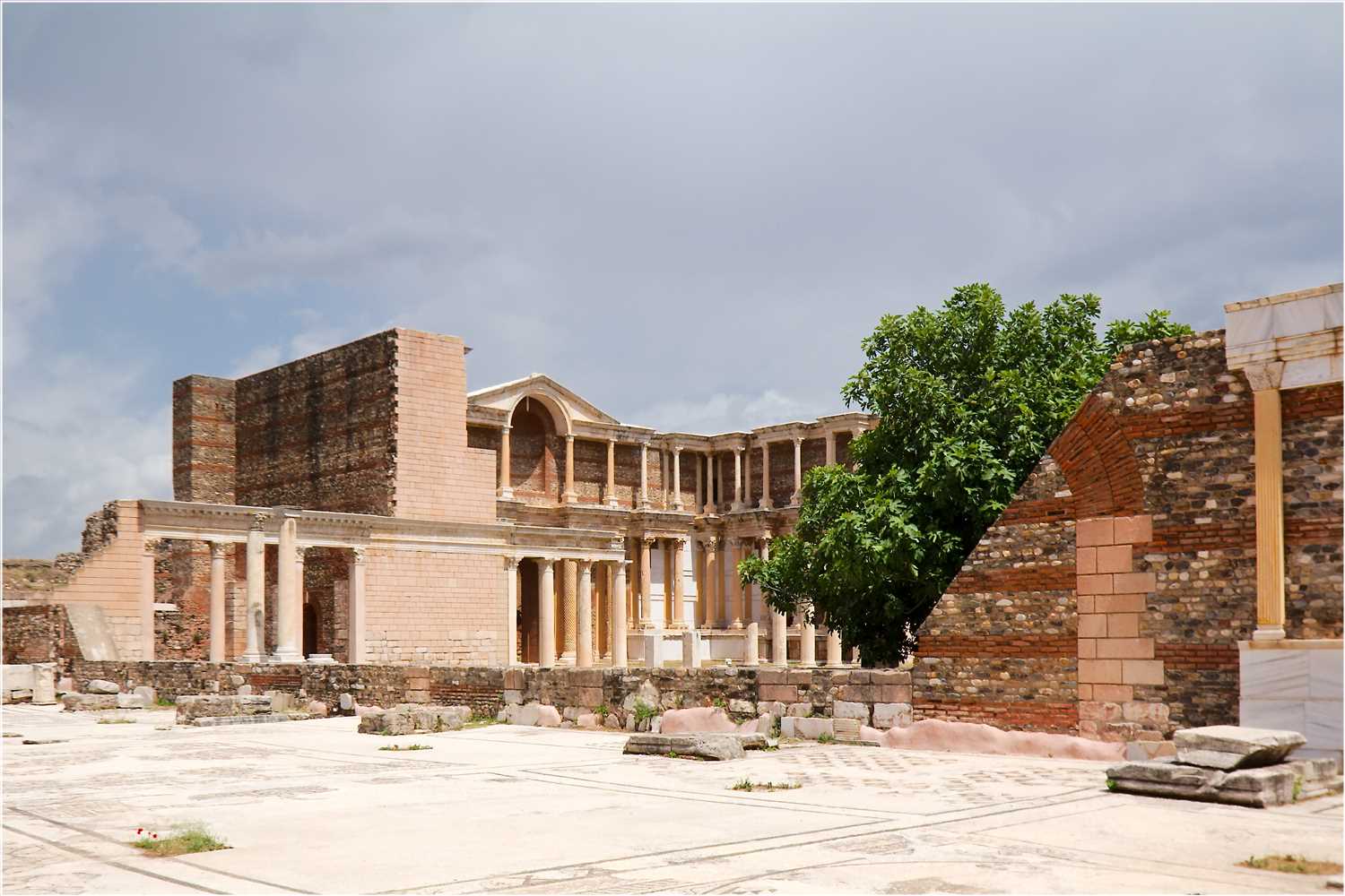 Der Bau steht im Zentrum der Stadt. An der Stelle des späteren Gebäudes standen zunächst ein Bad und ein Gymnasium. Durch Umbauten eines Teiles des Bades entstand daraus eine große Halle mit einem davor gesetzten Atrium, in dessen Mitte noch heute ein gewaltiger, steinerner Kelch steht. Der Bau war 120 m lang, 18 m breit und stellt eine typische Basilika dar. Es gibt eine lange Zentralhalle, die von zwei Säulenreihen flankiert wird. Am Ende befindet sich eine Apsis und ein marmorner Tisch. Es wird vermutet, dass sie ungefähr 1.000 Betende fassen konnte, was wiederum einen Hinweis auf die Größe der Gemeinde und ihren Wohlstand in Sardes hinweist. Der Bau ist reich mit geometrischen Mosaiken ausgestattet. Die Wände waren mit farbigem Marmor verkleidet.