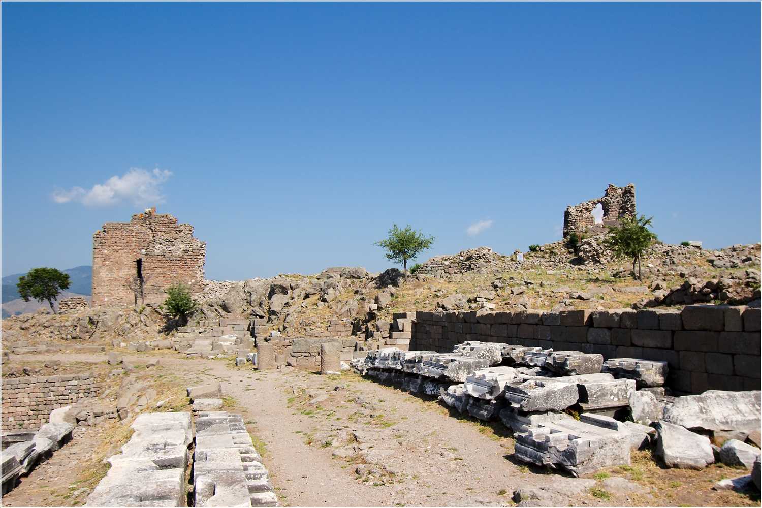 Das berühmteste Bauwerk ist der vermutlich dem Zeus und der Athena geweihte Pergamonaltar, dessen Rasterfundament sich noch auf dem Gebiet der antiken Oberstadt befindet. Die Reste des Pergamonfrieses, der ihn ursprünglich zierte, sind im Berliner Pergamonmuseum zu besichtigen, wo in einer Teilrekonstruktion des Pergamonaltares die seinerzeit nach Deutschland gelangten Friesplatten eingebaut sind.