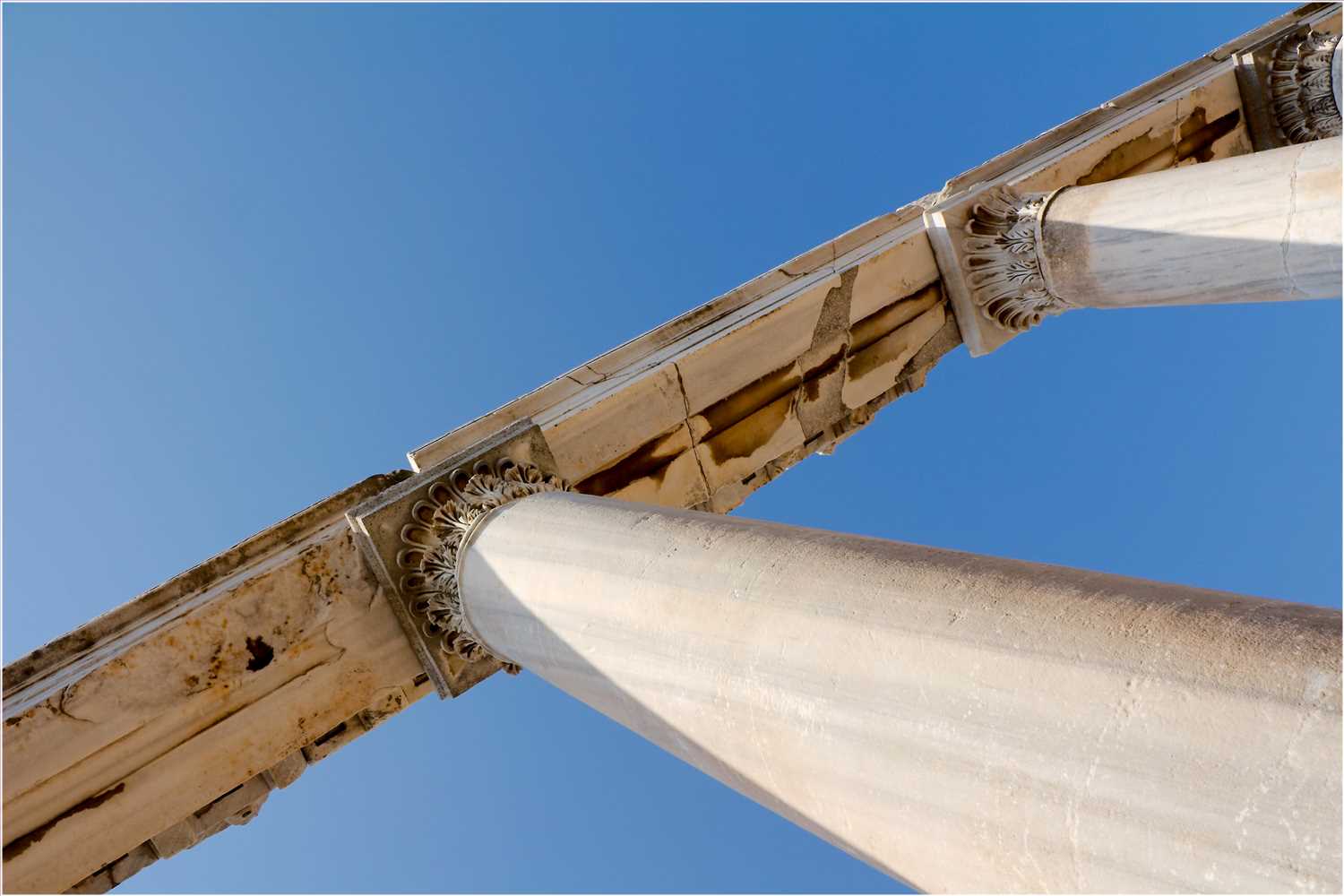 Auf der so vorbereiteten Terrasse erhob sich mittig der Tempel auf einem von Süden her über eine Freitreppe zugänglichen, 2,90 Meter hohen Podium. Der Tempel selbst war ein rund 18 Meter breiter Peripteros korinthischer Ordnung mit 6 × 9 Säulen und zwei Säulenstellungen zwischen den Anten. Im Norden wurde das Areal durch eine erhöht stehende Säulenhalle abgeschlossen, während Ost- und Westseite lediglich von einfachen Quadermauern begrenzt waren. All dies gehört zu einer ersten Bauphase, deren Beginn in die Zeit Trajans zu datieren ist, die aber erst in hadrianischer Zeit abgeschlossen wurde. Bereits in der Zeit Hadrians wurde die ursprüngliche Anlage verändert: Die Quadermauern wurden durch Säulenhallen ersetzt, die jeweils im Süden sich anschließende Kopfbauten erhielten. Hierfür wurde die Schildmauer, die sich mit Bogenöffnungen zum Tal hin öffnete, entsprechend nach Osten und Westen erweitert.
